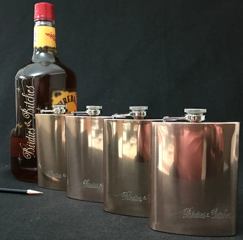 As for the engraving…an experienced #3 round carbide was used on the stainless steel flasks. Also experienced, was the #8 round carbide used on the bottle of FIREBALL, cinnamon-flavored whiskey. Antique Gold Rub ‘N Buff filled the engraved letters on the bottle.