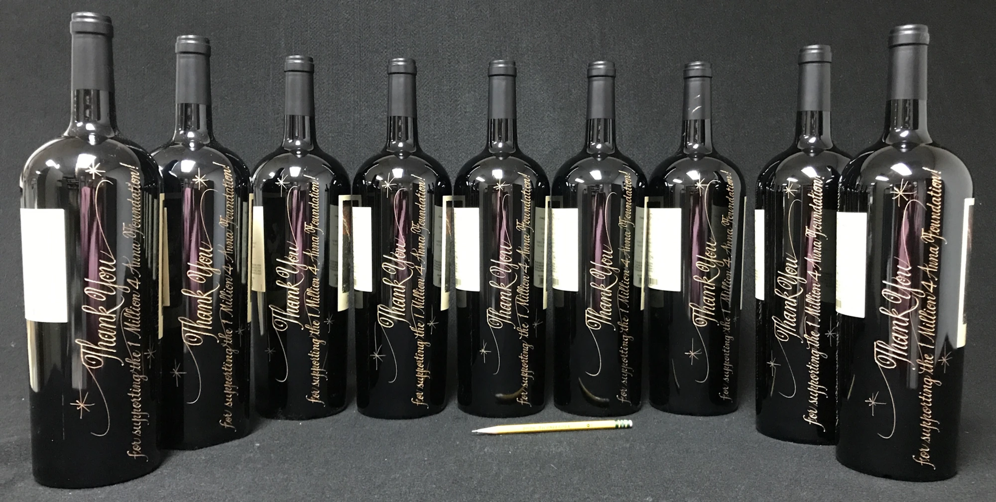 An area high school employee contacted me about engraving the bottles as part of a larger package of appreciations for 9 businesses contributing to a special foundation for a child who died of a rare disease. No names or dates on the bottles, which was somewhat unusual; names were on some of the other of the foundation’s gifts.