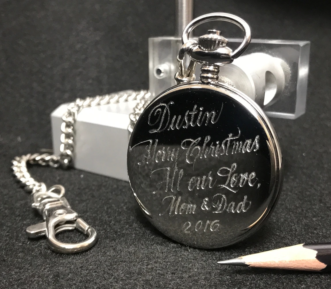 Quite often timepieces are brought to us engravers for personalization. Some go into a pocket. Some go around the neck. Some are worn on the wrist, Some sit on a shelf or hang on the wall.