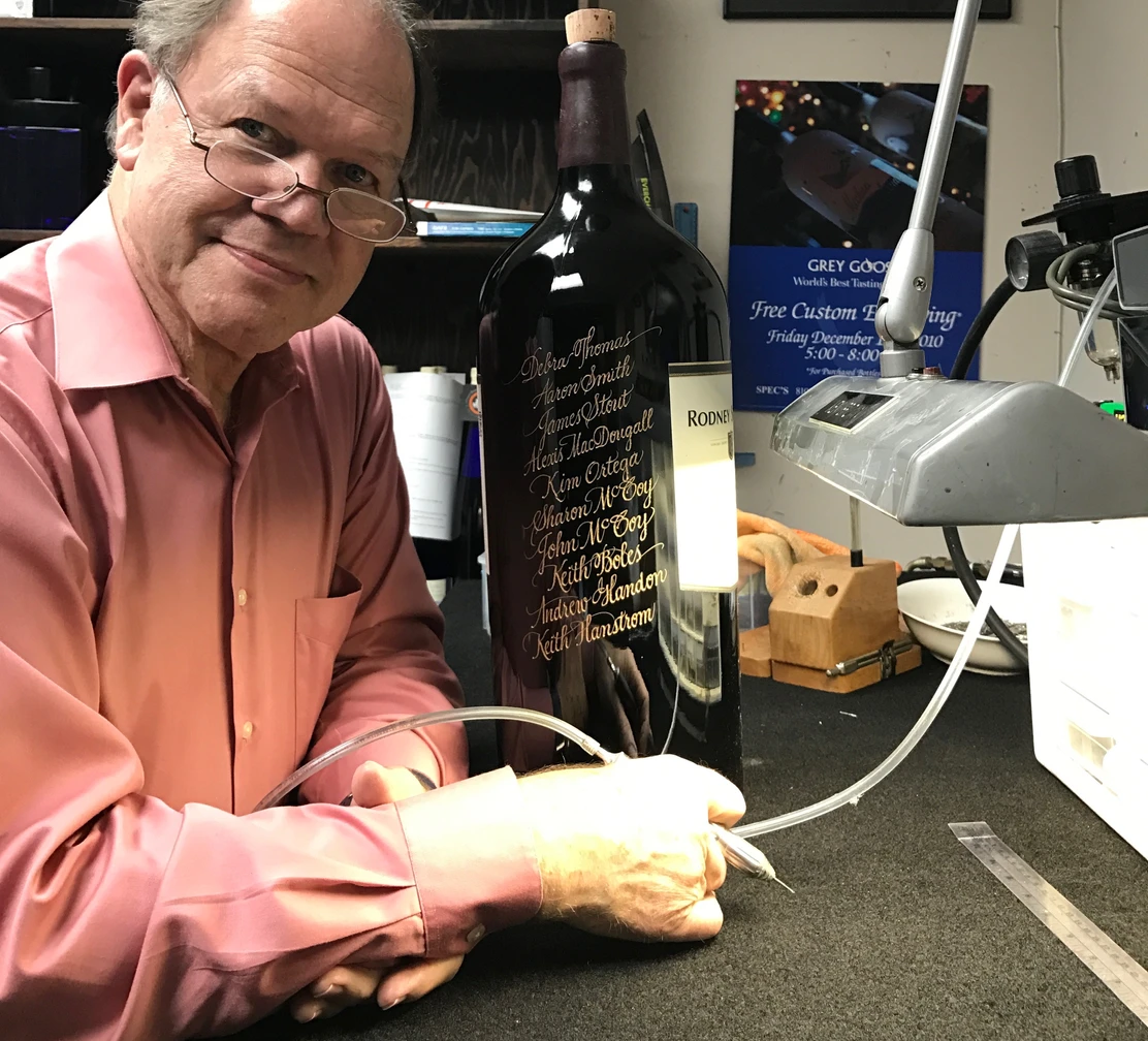 An after-the-celebration request for names on the empty bottle. I used a brand new #6 round carbide to hand-engrave each name. Each was filled with a bit of Antique Gold Rub ‘N Buff. Let’s see, if evenly distributed among the ten partiers, each drank a full bottle + about 15 milliliters. This big boy holds the equivalent of 12 regular size (750 ml) bottles of RODNEY STRONG Cabernet Sauvignon. CHEERS!