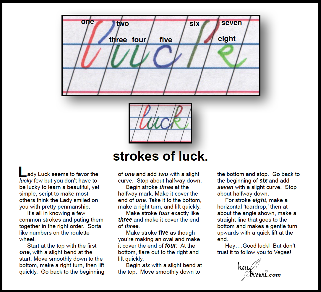 I’ve always remembered that quote and think of it often. I chose the word luck to illustrate the simplicity of the way I make and teach the script I do with pen and ink, and markers, and a dental drill for engraving. It’s an organized system for anyone to improve their handwriting, if desired.